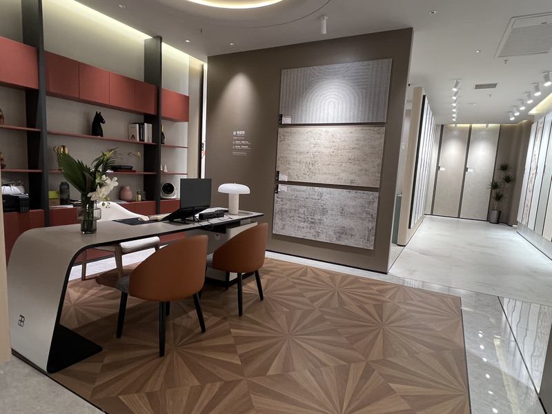 在商場6號廳的諾貝爾瓷磚門店中,瓷磚樣品不再是一塊塊地掛在墻上展示,而是出現(xiàn)在不同的樣板間中,比如,茶室的地面鋪的是地毯磚,通過模仿地毯紋理和觸感提升美觀度和舒適度,同時保持瓷磚的耐用性和易清潔特性。
