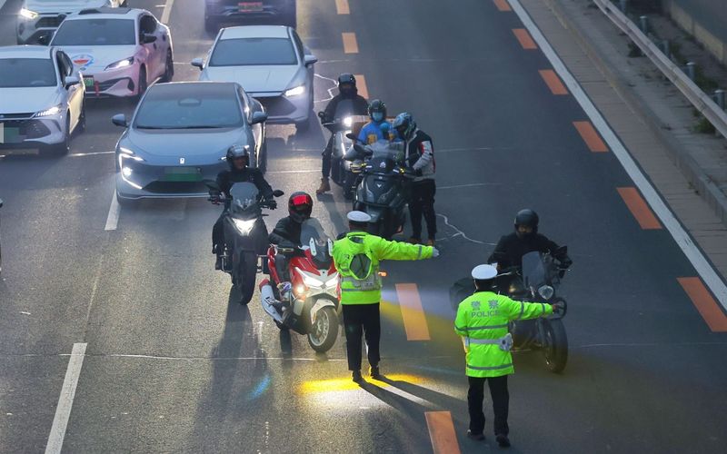 11月5日17時許,朝陽交通支隊雙橋大隊的民警在京通快速路出京方向開展執(zhí)法檢查,主要針對摩托車違規(guī)駛?cè)胫髀饭粚S玫酪约斑`規(guī)占用應(yīng)急車道等違法行為。十余輛摩托車被攔下,交警根據(jù)其違法行為進(jìn)行處罰。