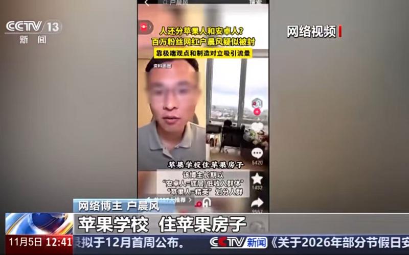據(jù)央視新聞報道,擁有百萬粉絲的網(wǎng)紅博主戶晨風(fēng),從展示跨國消費差異到制造階層對立,以“蘋果、安卓論”收割流量,終因突破監(jiān)管紅線,9月20日,他在多個平臺的賬號被封禁,內(nèi)容被清空,隨后賬號被徹底注銷。