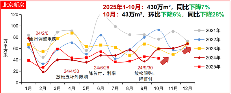 克而瑞統(tǒng)計數(shù)據(jù)也顯示,2025年10月北京新建商品住宅(含普通住宅、別墅,不含共有產(chǎn)權房)成交3194套,環(huán)比下跌1.9%,同比下跌22.9%;成交均價為58649元/平方米,環(huán)比下跌2.4%,同比上漲3.5%。