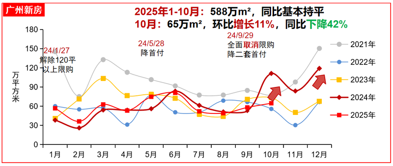 深圳同樣呈現(xiàn)下行趨勢,10月新房銷售面積17萬平方米,環(huán)比下降4%,同比下降59%。廣州則出現(xiàn)環(huán)比回升,新房銷售面積65萬平方米,環(huán)比增長11%,同比下降42%。