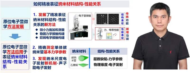 如何精準(zhǔn)建立納米材料的結(jié)構(gòu)-性能關(guān)系是低維納米材料研究的一個(gè)關(guān)鍵問題。納米材料具有性能對(duì)結(jié)構(gòu)和環(huán)境敏感、不同個(gè)體樣品之間結(jié)構(gòu)和性能經(jīng)常不同等特點(diǎn),基于不同樣品、不同設(shè)備分別表征結(jié)構(gòu)和性能的傳統(tǒng)方法難以精準(zhǔn)建立納米材料的結(jié)構(gòu)-性能關(guān)系。為此,本項(xiàng)目發(fā)展了一系列原位電子顯微學(xué)方法,解決了如何在電子顯微鏡中精確表征單體納米材料的力學(xué)、電學(xué)等物理性能的問題,實(shí)現(xiàn)了在同一設(shè)備環(huán)境下針對(duì)同一單體納米材料同時(shí)表征結(jié)構(gòu)和性能,提供了精準(zhǔn)表征納米材料結(jié)構(gòu)-性能關(guān)系的新方法,并通過此方法進(jìn)一步揭示了碳納米管、石墨烯等重要納米材料的結(jié)構(gòu)-性能關(guān)系,包括:精確測定了單體碳納米管的多個(gè)基本力學(xué)參數(shù),建立了力學(xué)參數(shù)與結(jié)構(gòu)的關(guān)系;在低維碳納米材料中發(fā)現(xiàn)了聲子助電子發(fā)射新機(jī)制,建立了物理維度與熱電子發(fā)射的關(guān)系等。研究成果為相關(guān)納米材料在納米電子器件等領(lǐng)域的應(yīng)用提供了重要結(jié)構(gòu)-性能關(guān)系的支撐,共發(fā)表SCI論文80余篇,5篇代表作共被SCI他引600余次。
