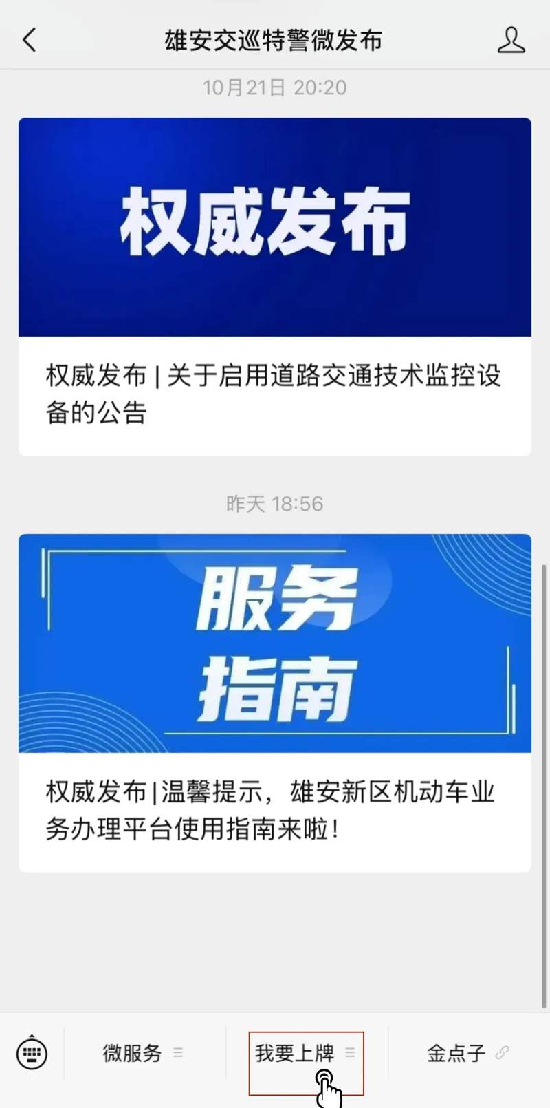 第一步:進(jìn)入“雄安交巡特警微發(fā)布”公眾號(hào),點(diǎn)擊“我要上牌”進(jìn)入新版業(yè)務(wù)辦理平臺(tái)→點(diǎn)擊頁面下方“我的”,授權(quán)獲取手機(jī)號(hào)即可快捷登錄。