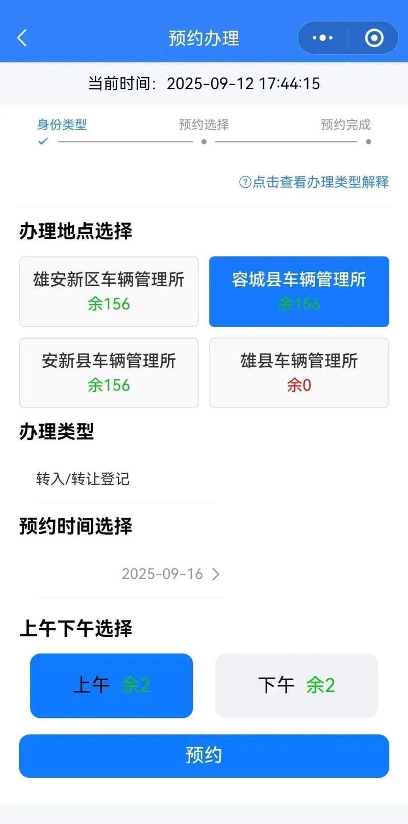新區(qū)企業(yè)辦理新車注冊、舊車轉(zhuǎn)入、舊車過戶業(yè)務(wù)同樣需先進(jìn)行預(yù)約,預(yù)約成功后申請上牌資格。