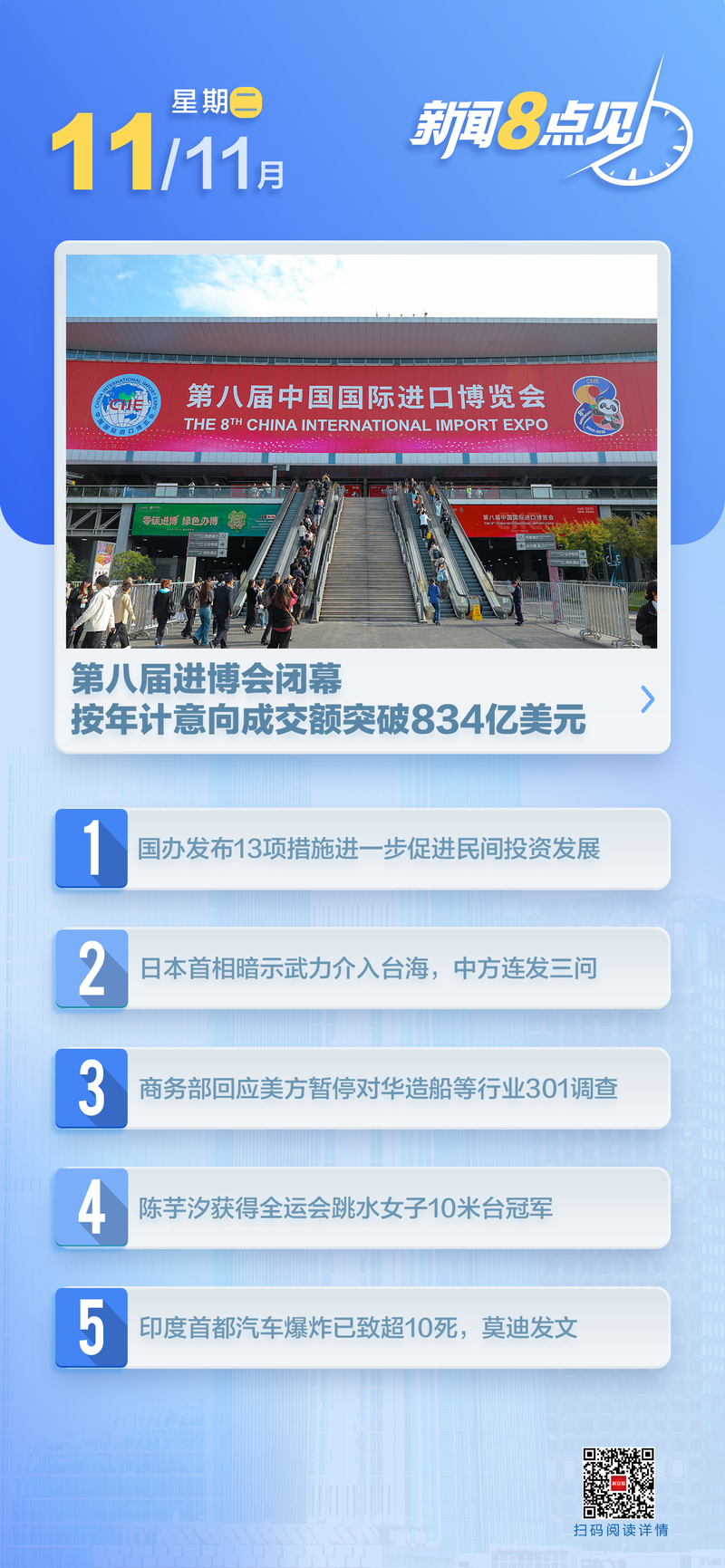 11月10日,第八屆進博會閉幕新聞通氣會在國家會展中心(上海)舉行。據中國國際進口博覽局黨委書記、副局長吳政平介紹,本屆進博會企業(yè)展面積超過36.7萬平方米,共有來自138個國家和地區(qū)的4108家企業(yè)參展,展覽面積和企業(yè)數量均創(chuàng)歷史新高。其中,世界500強和行業(yè)龍頭企業(yè)達290家,180家企業(yè)成為“八屆全勤生”,充分體現中國超大規(guī)模市場的強大“磁吸力”。本屆進博會成交活躍,按一年計意向成交額達834.9億美元,比上屆增長4.4%,創(chuàng)歷史新高。(新京報)閱讀全文>>>