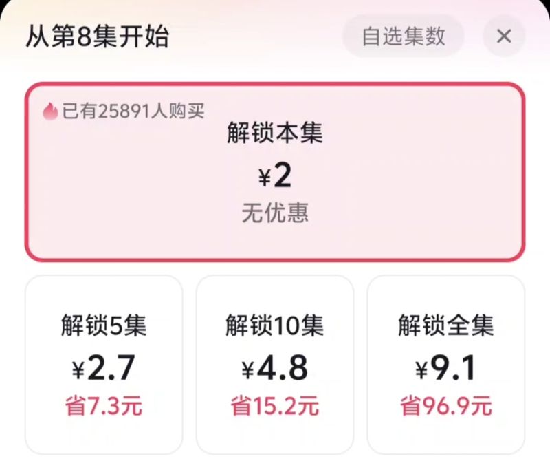 抖音某漫劇的付費解鎖頁截圖,該劇一共60集,解鎖全集需要9.1元,比單集付費更劃算。
