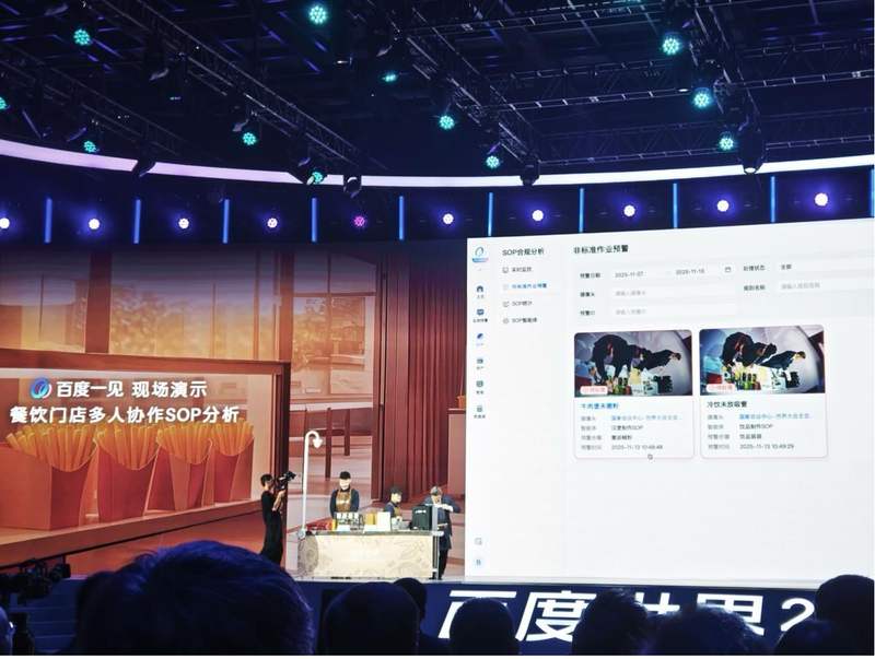 百度智能云事業(yè)群總裁沈抖現(xiàn)場做漢堡被AI智能體提醒“非標(biāo)準(zhǔn)作業(yè)”。 新京報(bào)貝殼財(cái)經(jīng)記者羅亦丹/攝