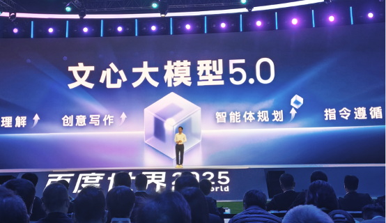 百度創(chuàng)始人李彥宏介紹文心大模型5.0。新京報(bào)貝殼財(cái)經(jīng)記者羅亦丹/攝