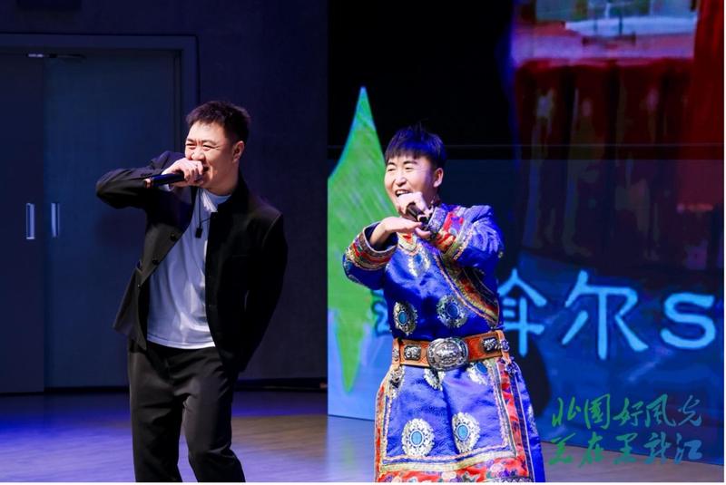 壓軸的“旭日東升 踏雪尋北”篇章將氣氛推向高潮。佳木斯以充滿活力的說唱《嘿嘿佳木斯》推介佳木斯各區(qū)縣的特色冰雪項(xiàng)目與壯美邊境風(fēng)光,點(diǎn)燃了觀眾對(duì)“華夏東極”的旅游期待;大興安嶺地區(qū)文旅推介官以“極品生態(tài)”“極北民俗”“極致體驗(yàn)”三個(gè)維度,帶領(lǐng)觀眾直抵祖國版圖的“金雞之冠”,極具民族風(fēng)情的《鄂倫春小調(diào)》與《一路向北到興安》兩首歌曲,令在場師生感受到中華傳統(tǒng)文化與冰雪文化交融的純粹與震撼,激發(fā)出大家對(duì)壯美河山的無限向往。