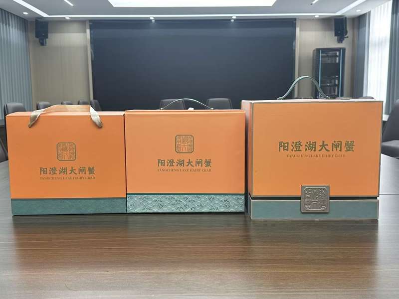陽澄湖大閘蟹專用包裝形象。從左至右依次為普通款、中端款、高端款。