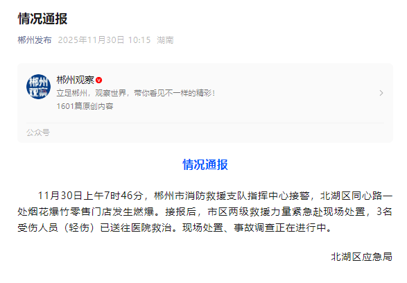 新京報訊 11月30日,“郴州發(fā)布”官微發(fā)布情況通報: