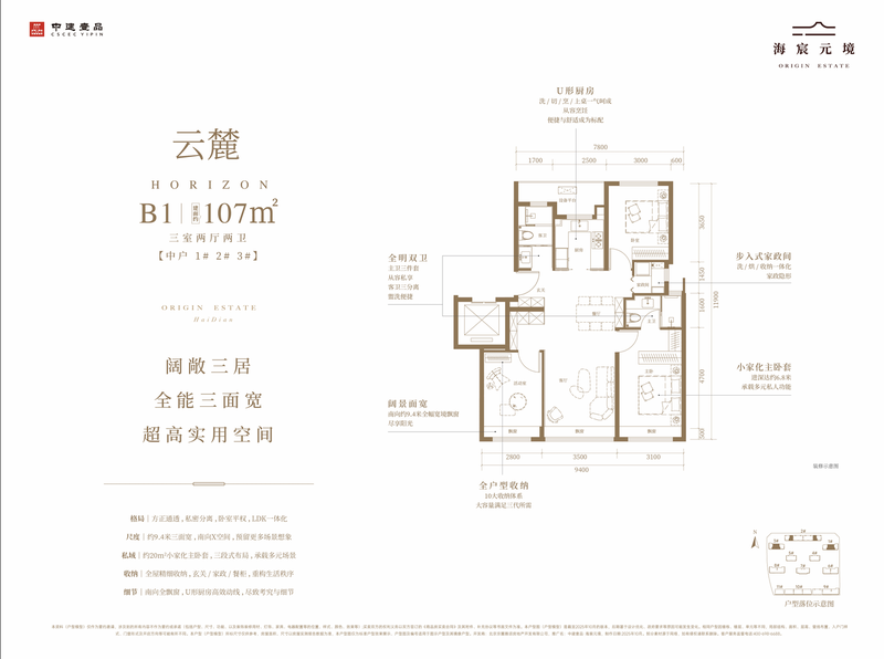 107平方米B1三居堪稱三口之家的全周期理想居所,戶型方正通透。約9.4米南向三面寬搭配可拓展的南向X空間,為生活場景預(yù)留更多想象;約20平方米小家化主臥套采用三段式布局,承載多元場景;全屋精細(xì)化收納系統(tǒng)(玄關(guān)柜、家政區(qū)、餐邊柜)重構(gòu)空間秩序;U形廚房優(yōu)化操作動線,南向全飄窗增添生活質(zhì)感。其端戶版本更配備約10米超長轉(zhuǎn)角飄窗,L形大采光面實現(xiàn)270°無遮擋觀景,兼具實用與顏值。