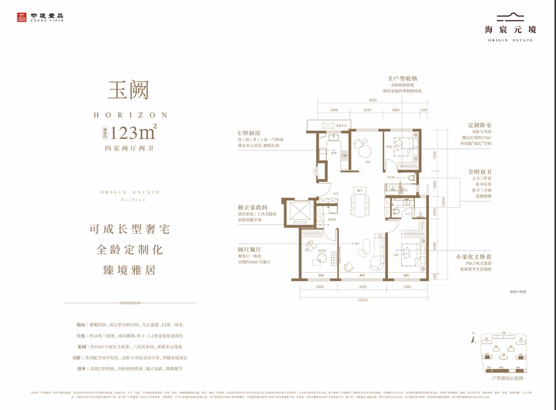 123平方米四居兩衛(wèi),八窗全明戶型,南向三面寬拓展至約10.25米,每面寬均配飄窗;3.95米面寬客廳與餐廳同寬,空間開闊大氣。南向主臥套房自帶步入式衣帽間與獨立衛(wèi)浴,入戶玄關(guān)與獨立家政間提升生活便捷度;北向則規(guī)劃U形廚房、書房、次臥及三分離客衛(wèi),功能分區(qū)科學(xué)合理。