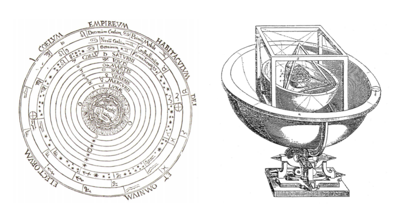 廣為人知的開普勒(1571―1630)構(gòu)想的宇宙模型,發(fā)表在《宇宙的神秘》(1596)一書中:他已經(jīng)拋棄了地心說,設(shè)想地球和五大行星的軌道分別位于大小不等的6個球面上,從里到外按照正八面體、正二十面體、正十二面體、正四面體、正六面體的順序依次套切,太陽居中心。