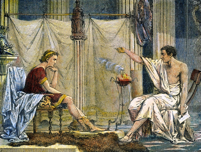 法國查爾斯·拉普蘭特的插圖版畫,《亞里士多德教導(dǎo)青年亞歷山大》(1866)。