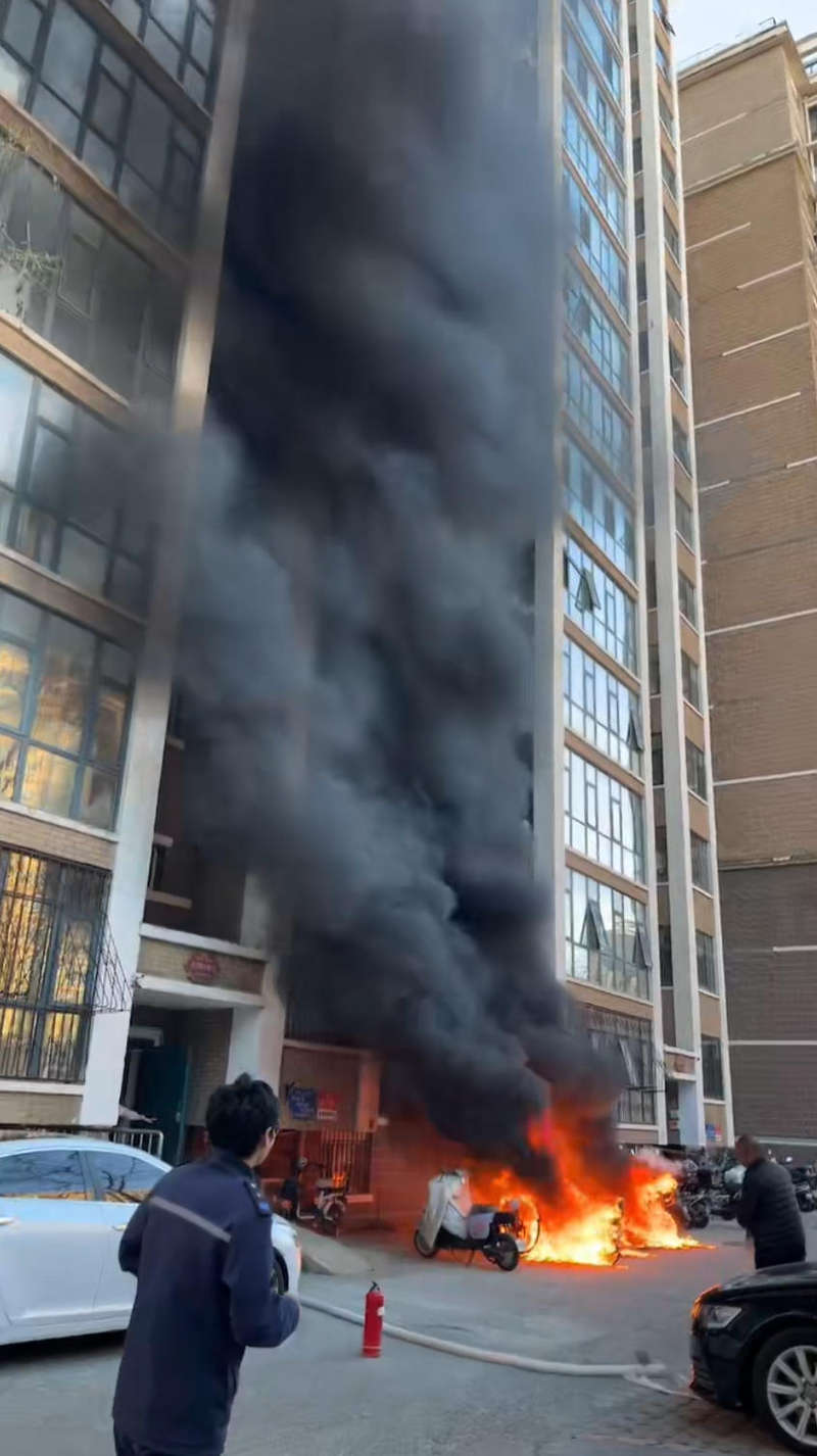 12月4日下午4點05分左右,正在家中臥室休息的劉女士,突然聽到窗外傳來“砰砰”的響聲,“聽起來很像放炮的聲音,我正納悶,家里的小狗突然跳下床,沖我大叫。我這才發(fā)現(xiàn),室內的白墻反射有大片紅光,再一看,窗外已經火光沖天,濃煙滾滾?!眲⑴口s緊跑到窗邊,發(fā)現(xiàn)是停在窗根兒下的一排電動車正在燃燒,味道嗆人。