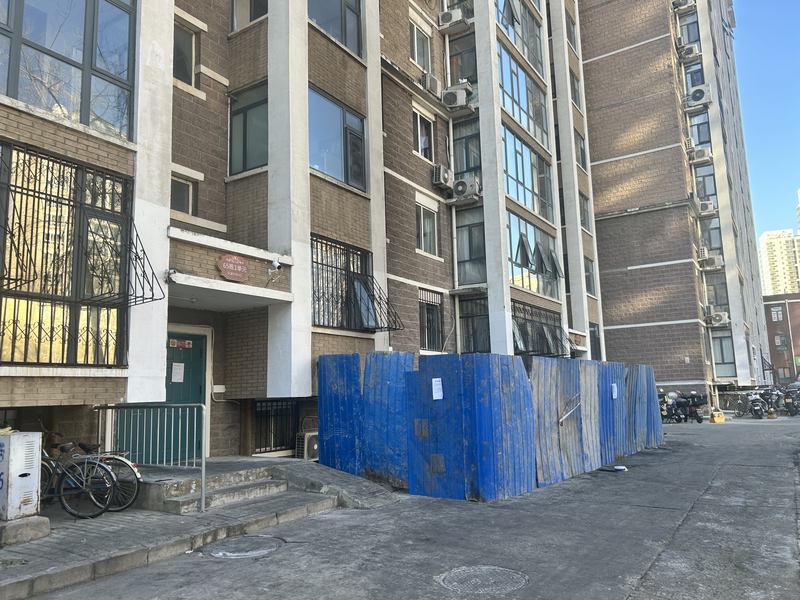 天通中苑65號樓前,起火處已立起施工圍擋。受訪者供圖