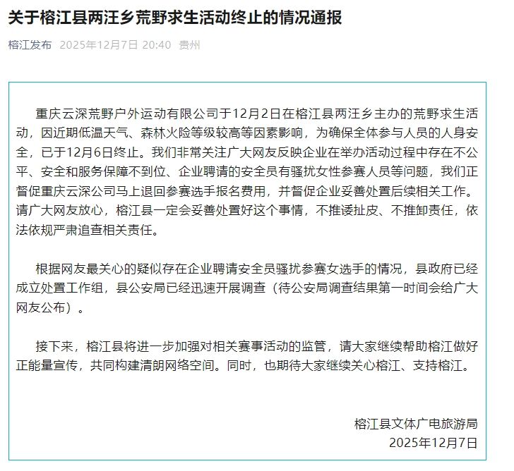 重慶云深荒野戶外運動有限公司于12月2日在榕江縣兩汪鄉(xiāng)主辦的荒野求生活動,因近期低溫天氣、森林火險等級較高等因素影響,為確保全體參與人員的人身安全,已于12月6日終止。我們非常關(guān)注廣大網(wǎng)友反映企業(yè)在舉辦活動過程中存在不公平、安全和服務保障不到位、企業(yè)聘請的安全員有騷擾女性參賽人員等問題,我們正督促重慶云深公司馬上退回參賽選手報名費用,并督促企業(yè)妥善處置后續(xù)相關(guān)工作。請廣大網(wǎng)友放心,榕江縣一定會妥善處置好這個事情,不推諉扯皮、不推卸責任,依法依規(guī)嚴肅追查相關(guān)責任。