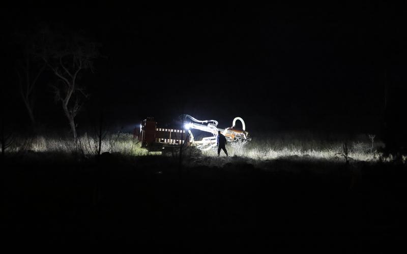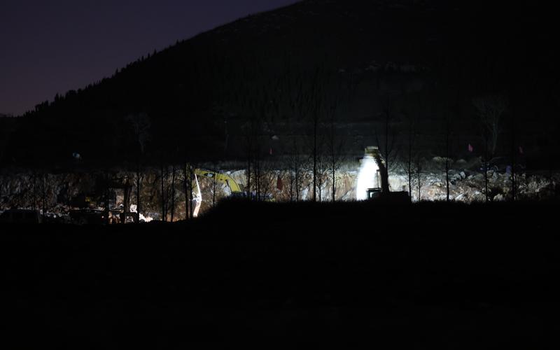 11月28日晚8時,圣泉生態(tài)公司養(yǎng)殖場內(nèi)兩臺鏟車正在開采礦石。 新京報(bào)記者 李英強(qiáng) 攝