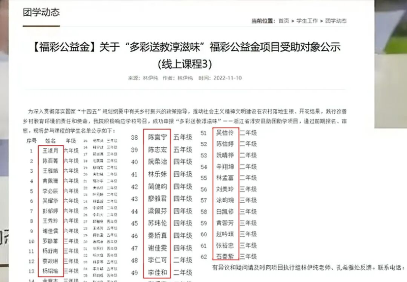 杭州師范大學(xué)人文學(xué)院2022年11月公布的“多彩送教淳滋味”福彩公益金項(xiàng)目中,線上課程受助對(duì)象公示名單的多個(gè)人名,都來自“10000中國普通人名大全”。
