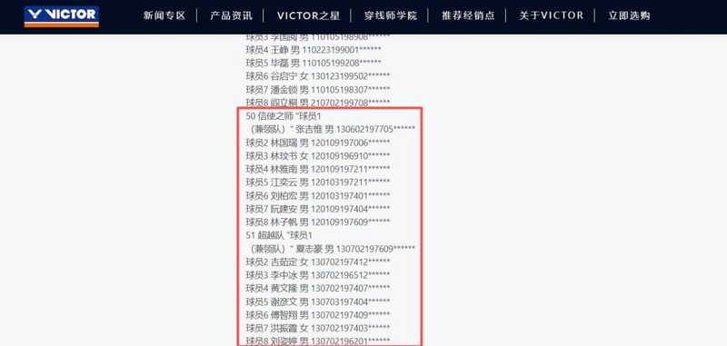 12月5日,有網(wǎng)友反映,“張吉惟”“林國瑞”等多人曾集體報(bào)名參加了知名運(yùn)動(dòng)品牌VICTOR舉辦的“2023VICTOR雙雄會(huì)天津站”。