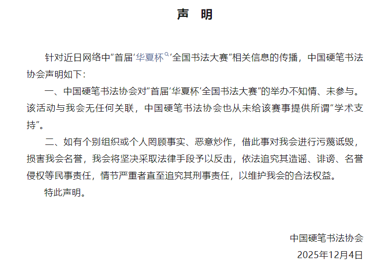 12月5日,中國硬筆書法協(xié)會(huì)針對(duì)此事發(fā)布聲明稱,沒有參與該活動(dòng),沒有給該賽事提供所謂學(xué)術(shù)支持。詳情>>>