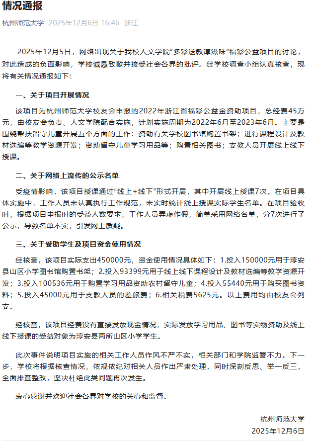 12月6日,杭州師范大學(xué)發(fā)布通報(bào)稱,該項(xiàng)目為杭州師范大學(xué)校友會(huì)申報(bào)的2022年浙江省福彩公益金資助項(xiàng)目,總經(jīng)費(fèi)45萬元。項(xiàng)目經(jīng)費(fèi)沒有直接發(fā)放現(xiàn)金情況,實(shí)際發(fā)放學(xué)習(xí)用品、圖書等實(shí)物資助及線上線下授課的受益對(duì)象為淳安縣兩所山區(qū)小學(xué)學(xué)生。