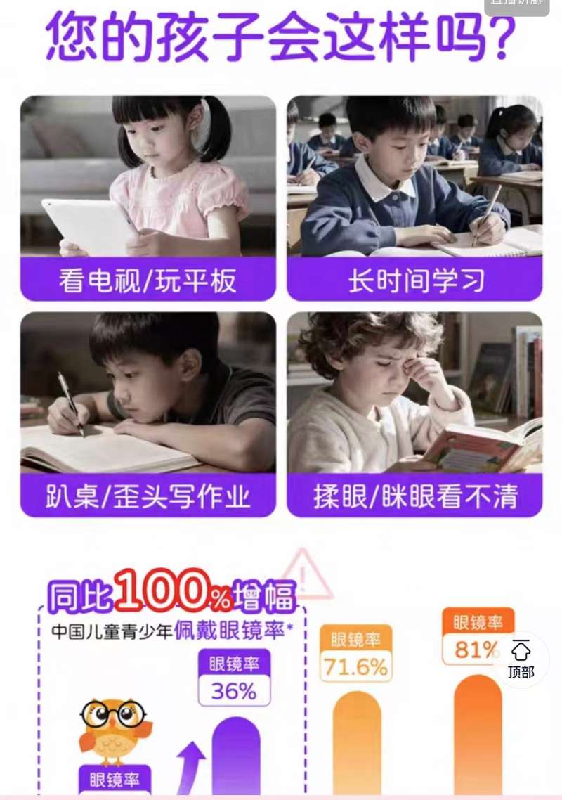 頁(yè)面配圖以“您的孩子會(huì)這樣嗎?”引出“長(zhǎng)時(shí)間看電子屏、趴桌寫作業(yè)、揉眼瞇眼”等場(chǎng)景,并以“90%孩子出現(xiàn)眼部問(wèn)題,家長(zhǎng)未察覺(jué)導(dǎo)致情況嚴(yán)重”的表述強(qiáng)化家長(zhǎng)焦慮。盡管未直接宣稱“防控近視”,但通過(guò)場(chǎng)景暗示與焦慮引導(dǎo),仍在傳遞“產(chǎn)品與解決近視問(wèn)題相關(guān)”的潛在信息。