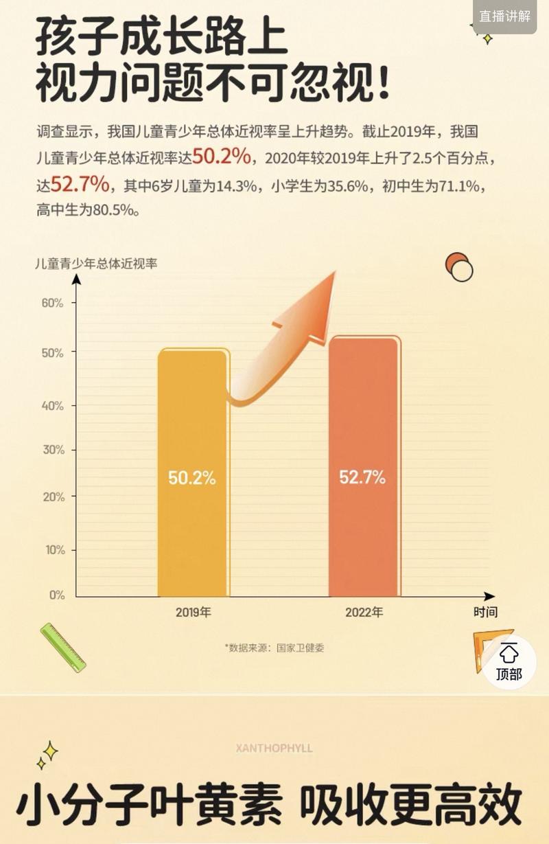 NaturElan海外旗艦店的吶兔葉黃素軟糖亦采用類似邏輯,其宣傳頁(yè)面強(qiáng)調(diào)“我國(guó)青少年總體近視率呈上升趨勢(shì),2020年達(dá)52.7%”,隨后立即銜接產(chǎn)品介紹,通過(guò)“問(wèn)題+數(shù)據(jù)+產(chǎn)品”的宣傳鏈條,間接暗示產(chǎn)品對(duì)近視問(wèn)題的改善作用,違規(guī)宣傳的隱蔽性更強(qiáng)。