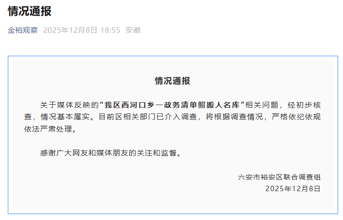 新京報訊 12月8日,安徽省六安市裕安區(qū)聯(lián)合調(diào)查組發(fā)布情況通報,關(guān)于媒體反映的“裕安區(qū)西河口鄉(xiāng)一政務(wù)清單照搬人名庫”相關(guān)問題,經(jīng)初步核查,情況基本屬實。目前區(qū)相關(guān)部門已介入調(diào)查,將根據(jù)調(diào)查情況,嚴格依紀依規(guī)依法嚴肅處理。