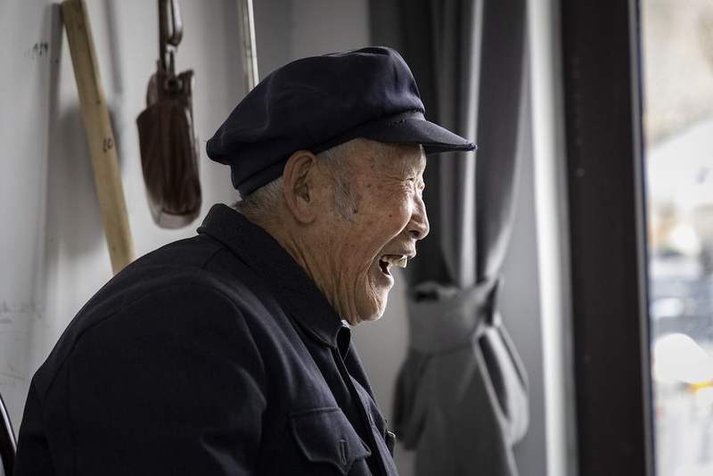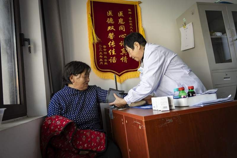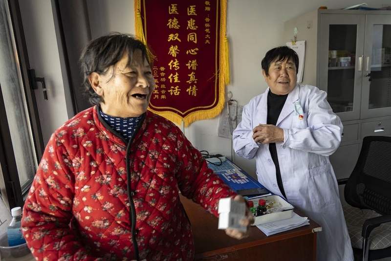 量血壓的老人還沒離開,又一位老人來到衛(wèi)生室,他佝僂著腰,步履蹣跚。