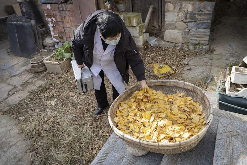 晉懷花查看齊文學(xué)家晾曬的銀杏葉,并指導(dǎo)他銀杏葉的中藥用法。