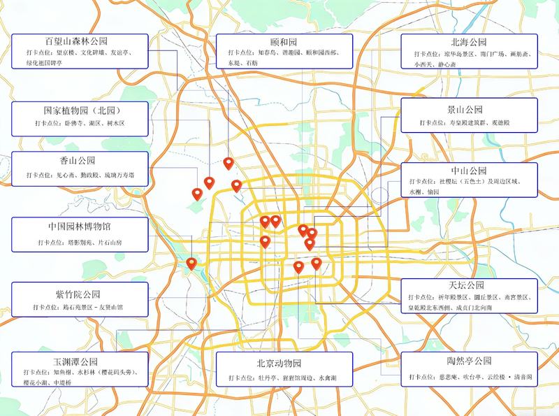 北京市公園管理中心推出“雪景打卡地圖”(點(diǎn)擊可放大查看)。北京市公園管理中心供圖