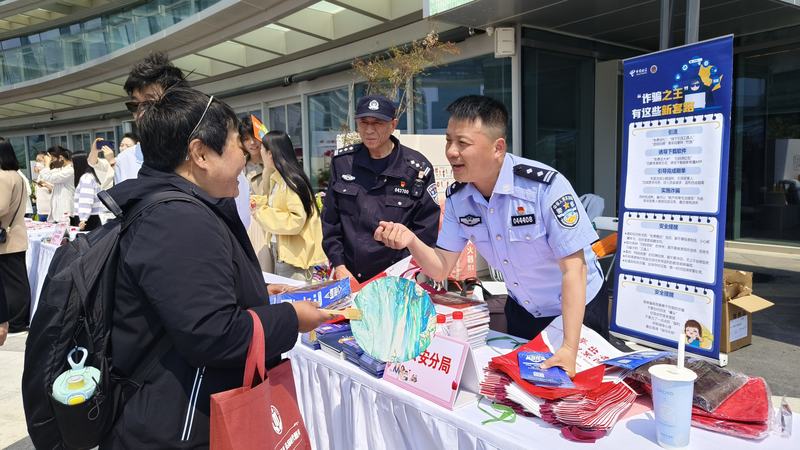 在戶外反詐宣傳活動上,邢運偉解答群眾疑問。受訪者供圖