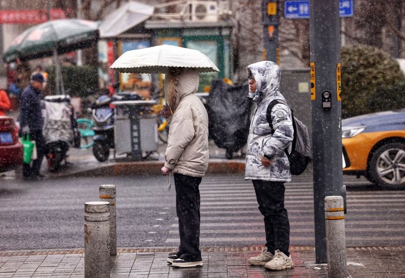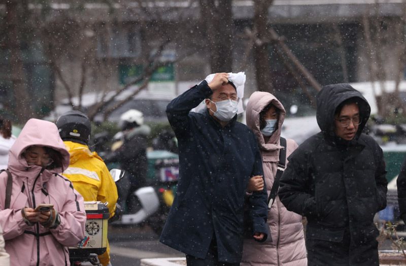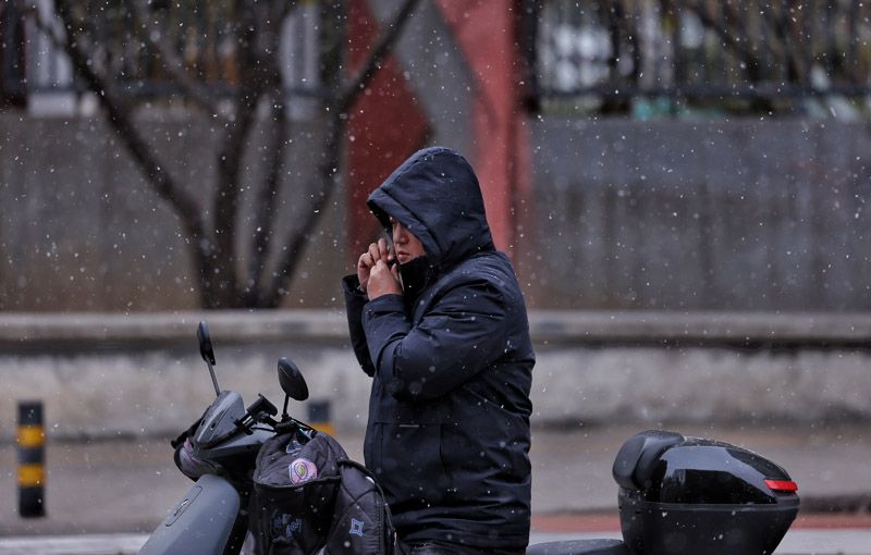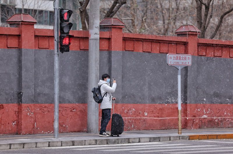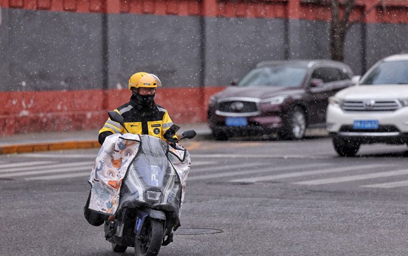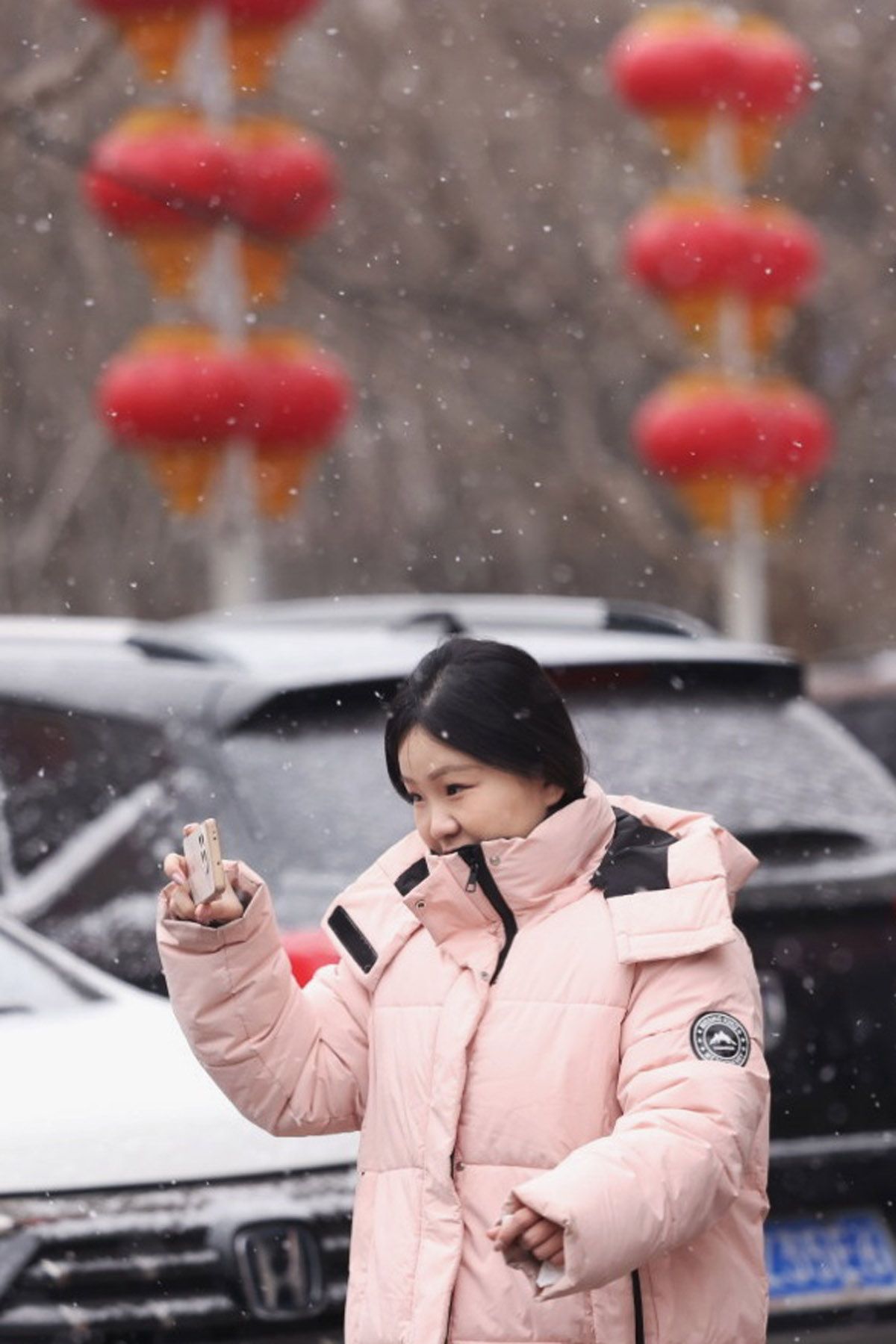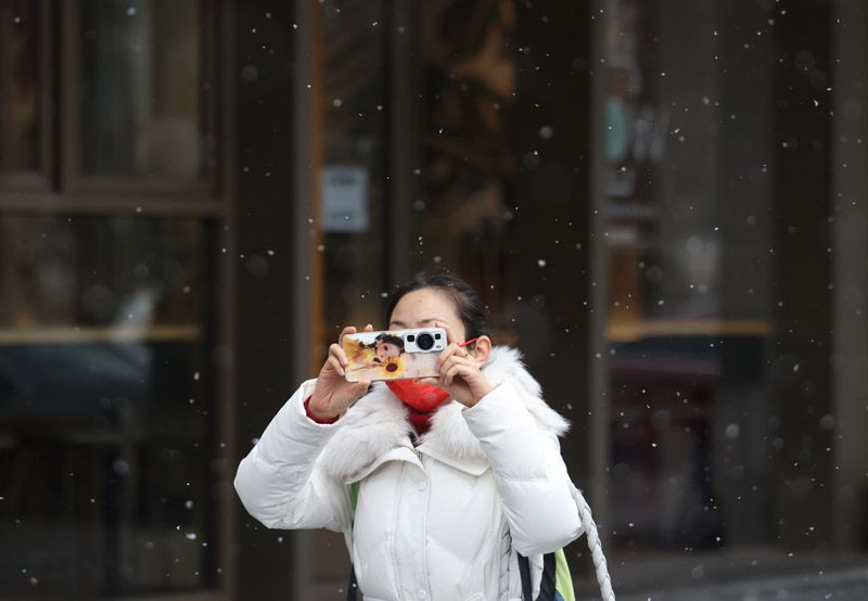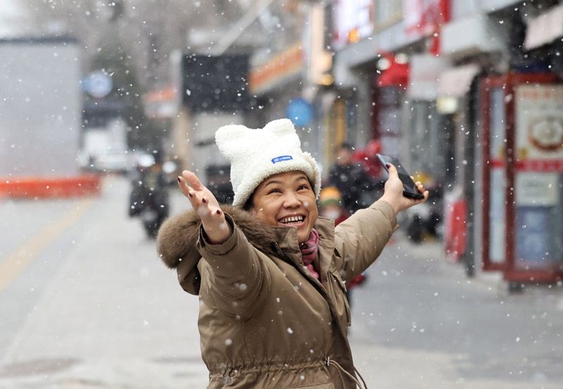 12月12日,朝陽區(qū)東大橋路,雪花飄落,北京市民喜迎降雪。北京市氣象臺已發(fā)布暴雪藍色預警和道路結(jié)冰橙色預警。