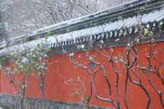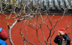 當(dāng)下正值花期的品種是十月梅,在臥佛寺紅墻黛瓦的映襯下,蠟梅更顯古樸典雅的韻味,為灰暗的天氣增加了一抹亮色。鵝黃色的花朵玲瓏剔透,仿若宣紙上的水墨畫,蠟梅在雪中散發(fā)出淡淡幽香,吸引游客扛著“長槍短炮”記錄下美景。