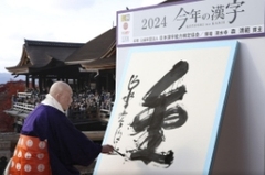 今年的年度漢字公布儀式照例在清水寺舉行。清水寺住持森清范在一張紙上揮毫寫下“熊”字。