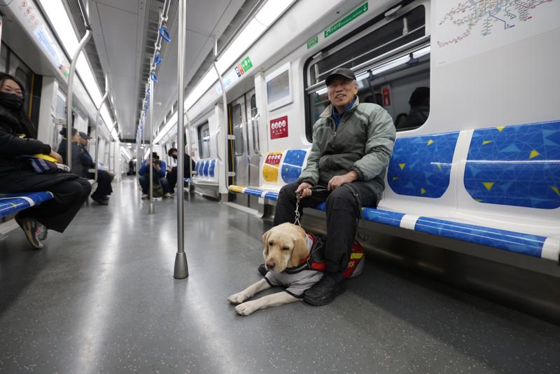 視障乘客王先生在導盲犬的陪伴下體驗乘坐17號線。新京報記者 王貴彬 攝