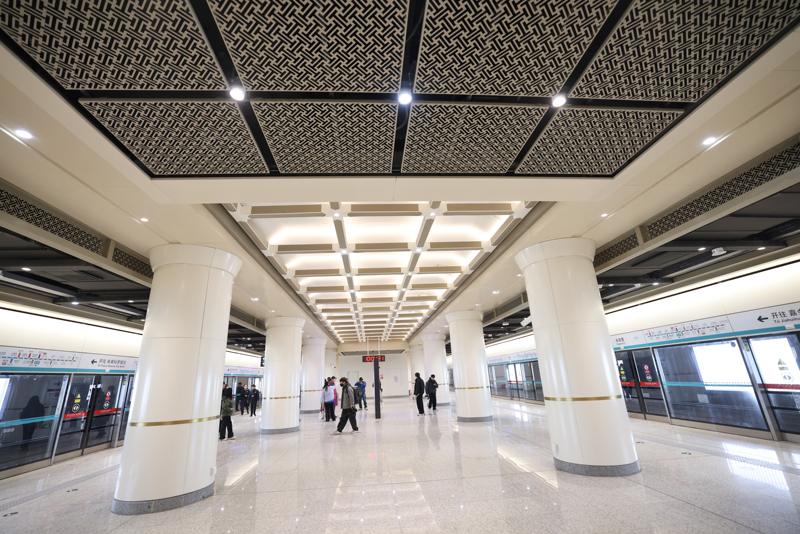 17號線中段車站的設計充分融合地域文化。例如,永安里站采用新中式風格,以米色為主色調(diào),襯以褐色線條與頂部藻井造型,展現(xiàn)中式空間之美;站內(nèi)布置“東方之韻”主題壁畫,創(chuàng)新運用玻璃瓦片融入故宮、太廟等經(jīng)典古建筑剪影,傳遞北京文化底蘊與都市活力。潘家園西站則結(jié)合結(jié)構(gòu)空間特點及周邊文化元素,融入青花瓷、古畫、花格等傳統(tǒng)紋樣,呼應站點周邊文化氛圍。