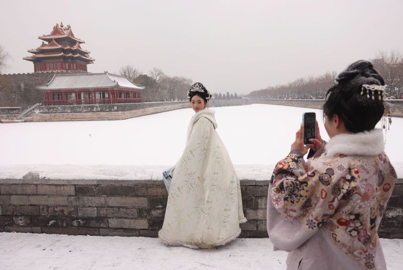 故宮初雪繪就冬日“頂流”,漢服翩躚點亮紅墻白雪
