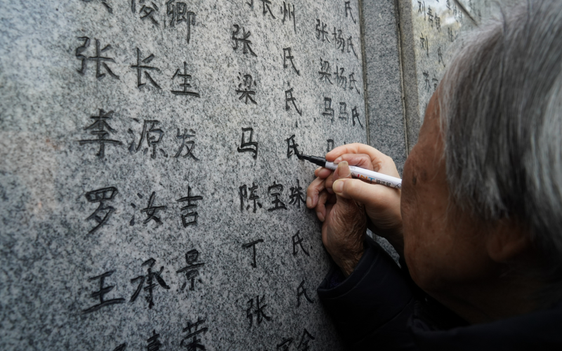 ▲11月30日,南京大屠殺幸存者夏淑琴在“哭墻”上描名。圖/新華社
