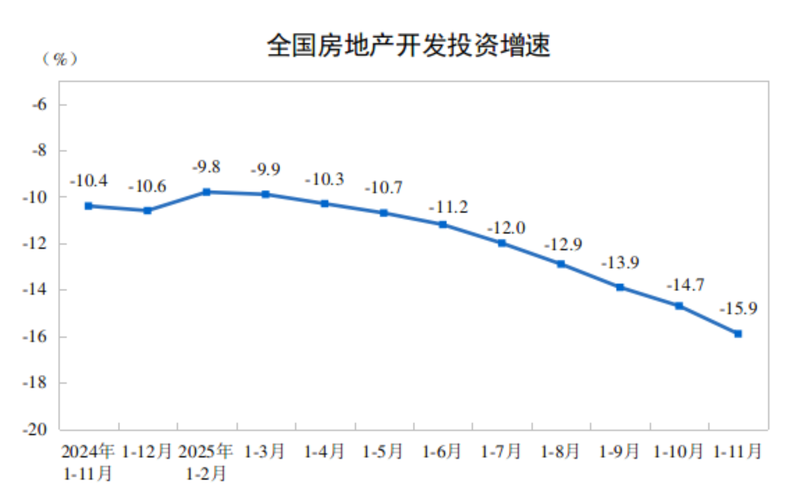 12月15日,國家統(tǒng)計局發(fā)布2025年1-11月份全國房地產(chǎn)市場基本情況的數(shù)據(jù)。其中,1-11月,全國房地產(chǎn)開發(fā)投資7.86萬億元,同比下降15.9%;新建商品房銷售額7.51萬億元,下降11.1%。值得關注的是,截至11月末,商品房待售面積7.53億平方米,比10月末減少301萬平方米,今年以來連續(xù)9個月減少。