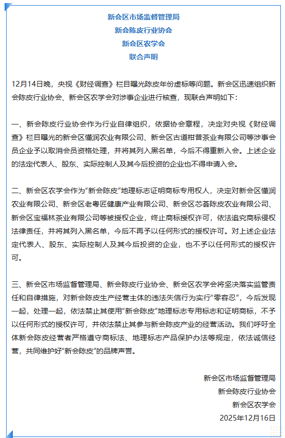新京報(bào)訊 據(jù)新會(huì)發(fā)布微信公眾號(hào)消息,12月14日晚,央視《財(cái)經(jīng)調(diào)查》欄目曝光陳皮年份虛標(biāo)等問(wèn)題。新會(huì)區(qū)迅速組織新會(huì)陳皮行業(yè)協(xié)會(huì)、新會(huì)區(qū)農(nóng)學(xué)會(huì)對(duì)涉事企業(yè)進(jìn)行核查,現(xiàn)聯(lián)合聲明如下: