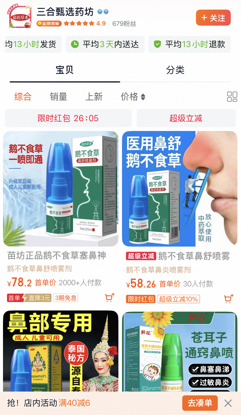 報道中提及的“三和堂草本藥坊”店鋪已無法搜索到。該店鋪曾銷售“消”字號產(chǎn)品“苗坊草本鵝不食草鼻舒噴霧劑”。記者以該產(chǎn)品名稱搜索,按銷量排行,排在第一位的“三合甄選藥坊”在該產(chǎn)品引導頁面寫著“3秒通鼻”“醫(yī)用同款”,點擊進入后,店鋪內(nèi)僅有4個產(chǎn)品鏈接,均為通鼻產(chǎn)品,其中兩款為“苗方草本鵝不食草鼻舒噴霧劑”,包裝相同,但價格卻不同,其中一個產(chǎn)品鏈接宣稱“一噴即通”,另一個則宣稱“醫(yī)用鼻舒”??头忉?,價格不同是因為原價和活動價的區(qū)別。
