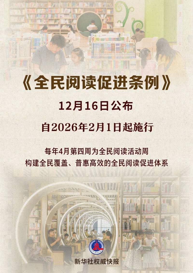 據(jù)新華社消息,《全民閱讀促進(jìn)條例》12月16日公布,自2026年2月1日起施行。條例共6章45條,分為總則、全民閱讀推廣、全民閱讀服務(wù)、全民閱讀保障、法律責(zé)任和附則。
