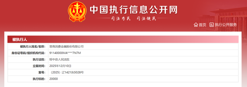 新京報貝殼財經(jīng)訊(記者黃鑫宇)12月15日,中國執(zhí)行信息公開網(wǎng)及企查查共同顯示,晉商消費金融股份有限公司(即晉商消費金融)成為被執(zhí)行人,執(zhí)行法院為遼寧省葫蘆島市綏中縣人民法院,立案時間為2025年12月10日,執(zhí)行標(biāo)的為20000元。