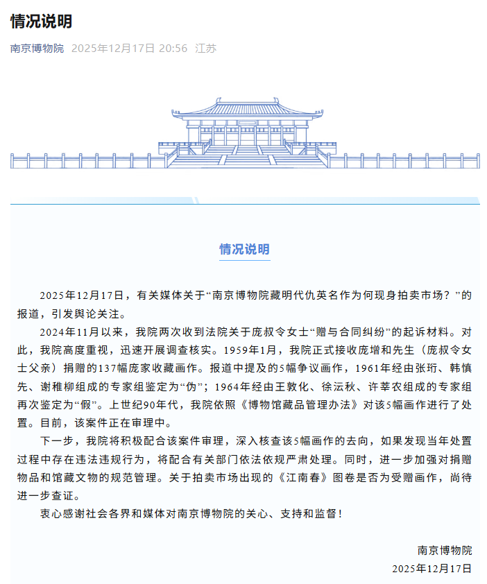 新京報(bào)訊 12月17日,南京博物院發(fā)布情況說(shuō)明:2025年12月17日,有關(guān)媒體關(guān)于“南京博物院藏明代仇英名作為何現(xiàn)身拍賣(mài)市場(chǎng)?”的報(bào)道,引發(fā)輿論關(guān)注。