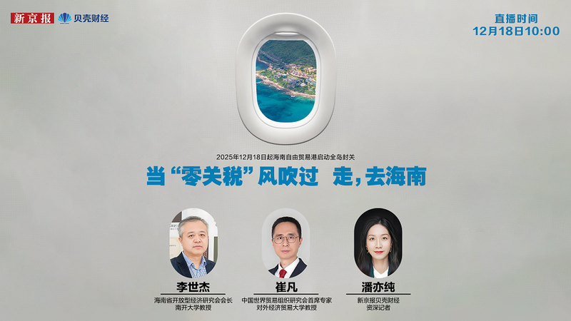 封關當日,海南省開放型經濟研究會會長、南開大學教授李世杰,中國世界貿易組織研究會首席專家、對外經濟貿易大學教授崔凡兩位重磅專家來到新京報貝殼財經直播間,帶來最新權威解讀,解鎖海南封關機遇密碼。