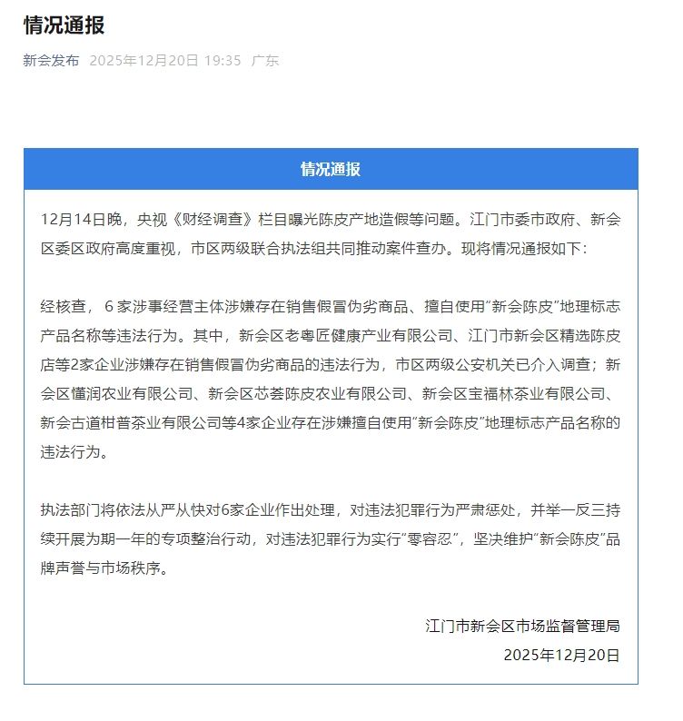 新京報(bào)訊 據(jù)新會發(fā)布消息,12月14日晚,央視《財(cái)經(jīng)調(diào)查》欄目曝光陳皮產(chǎn)地造假等問題。江門市委市政府、新會區(qū)委區(qū)政府高度重視,市區(qū)兩級聯(lián)合執(zhí)法組共同推動案件查辦。現(xiàn)將情況通報(bào)如下: