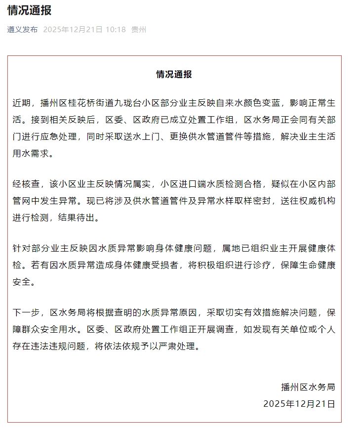 新京報(bào)訊 貴州省遵義市播州區(qū)水務(wù)局12月21日通報(bào):近期,播州區(qū)桂花橋街道九瓏臺(tái)小區(qū)部分業(yè)主反映自來水顏色變藍(lán),影響正常生活。接到相關(guān)反映后,區(qū)委、區(qū)政府已成立處置工作組,區(qū)水務(wù)局正會(huì)同有關(guān)部門進(jìn)行應(yīng)急處理,同時(shí)采取送水上門、更換供水管道管件等措施,解決業(yè)主生活用水需求。